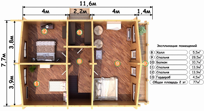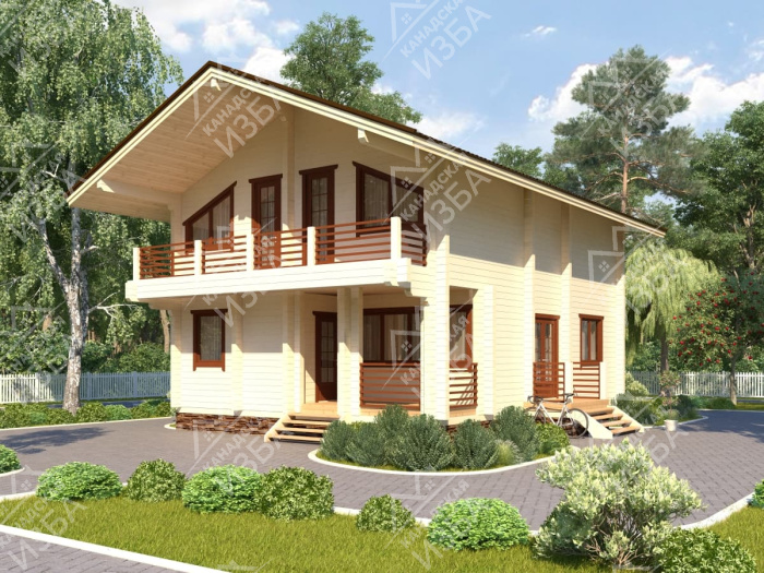 Экстерьер деревянного дома смотрится красиво за счет большого балкона, расположенного на втором этаже, а также окошек с небольшими скосами. Внутри имеется все необходимое для полноценного проживания, включая 4 спальни, гардеробную, холл, гостиную, кухню и сантехнический узел. Из достоинств такого коттеджа выделяют: