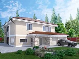 Роскошный двухэтажный дом имеет общую площадь 183 м2, его размеры – 9,9х11,5 м. Войти в дом можно через крыльцо, за которым расположен небольшой тамбур (4,8 м2). Рядом с тамбуром находится котельная площадью 7,3 м2.