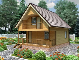 Площадь первого этажа составляет 54,3 м2. Здесь расположилась светлая гостиная (16,4 м2) совмещенная с кухней (5,8 м2). Из просторного холла можно попасть в предбанник, совмещенный с душевой и парной. Из дома можно попасть на уютную террасу, огражденную перилами с точеными деревянными балясинами.