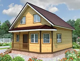 По проекту каркасный дом Оазис имеет размеры 7х9 метров, причем, помимо всего прочего, здесь имеется мансардный этаж. Благодаря этому здесь располагается 3 спальни, санузел, детская, гостиная-кухня и большой холл. Со стороны коттедж (дачные домики эконом класса) выглядит добротно, причем имеет крытое крыльцо, надежно защищающее входную группу от атмосферных осадков и ветра.