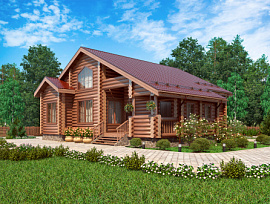 С первого взгляда на строение можно отметить его стиль, выдержанный в рамках классического загородного коттеджа из оцилиндрованного бревна, венцы красиво смотрятся на углах дома, а удлиненный скат крыши прикрывает крыльцо. Общая площадь коттеджа составляет 123,5 м2, чего достаточно для комфортного проживания семьи из 4 человек. К особенностям коттеджа Дворянское гнездо можно отнести: