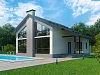 Двухэтажный дом с панорамным стеклянным фасадом. План 9Х12,5 м, общая площадь 155 кв. м. Двускатная крыша с одной стороны образует навес над открытой верандой без ограждения.