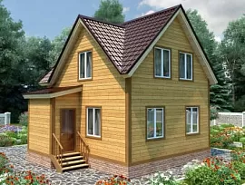 Размер дома «Ессей» 6*6 м. Полезная площадь почти в два раза больше – 63 м². Она увеличена за счет второго этажа под мансардной крышей.