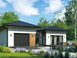 Несмотря на относительно небольшие размеры (7.5x8 м и общую площадь 107.5 м²) коттедж «Приозерный» – вместительное удобное жилье для семьи с ребенком. Входят в дом с террасы с небольшими ступенями, из прихожей перемещаются большую кухню-столовую (больше 20 м²) или комнату отдыха (гостиную 13.5 м²). Изюминка проекта – детская на первом этаже площадью 10.5 м² и собственным большим окном. Удобный санузел недалеко.