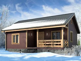 Практически по центру расположена входная зона. Зайдя внутрь дома, сразу попадаешь в уютную гостиную. Такая планировка считается оптимальной для загородных домов, предназначенных для отдыха. Из гостиной можно пройти в холл, а уже из него – в спальни, кухню или санузел. Первая спальная имеет смежную с террасой стену, поэтому одно из двух ее окон выходит именно на зону террасы. Вторая спальная – угловая, с одним двустворчатым окном. Санузел совмещен, там достаточно свободного пространства. Площадь кухни в доме «Алеша Попович» очень внушительная – 22,5 м2. Это дает возможность легко разместить там не только необходимую утварь и бытовую технику, но и небольшую обеденную группу.