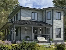 Дом «Эталон» – верх совершенства проектирования каркасных домов. Коттедж имеет трапециевидную архитектурную форму за счет того, что один из углов, находящихся слева от входной зоны, слегка скошен. Размеры дома составляют 7х8 м, что позволяет его легко разместить даже на небольшом загородном участке. При этом общая площадь коттеджа – 100 м2, что значительно больше, чем у многих типовых проектов.Кровля дома сложная, со множеством деталей и с несколькими слуховыми окнами. Благодаря такому проектировочному решению внешний вид постройки кажется более интересным, и, помимо того, визуально увеличивается общая площадь.