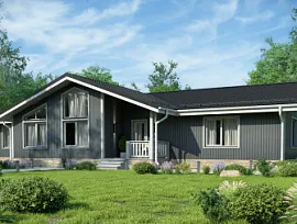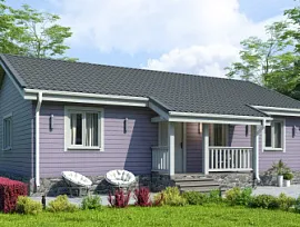 Общая площадь дома составляет 142,3 м2, размеры – 9 на 10 м. Вход оформлен в виде просторной террасы (14,63 м2), на которую ведет небольшая деревянная лестница с перилами или без (по желанию заказчика). Подобные варианты можно найти в категории проектов домов из бруса 6х8 площади.