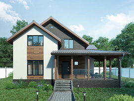 Под двускатной асимметричной кровлей из оцинкованного гофролиста расположена летняя терраса 14,1 м2 с легким ограждением из деревянных перил. Планировка из просторной кухни-гостиной в 26,2 м2 и 4 спален позволяет комфортно разместиться большой семье.