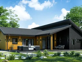 Дом по проекту «Южный» имеет размеры 6x7,5 м, что говорит о компактности, благодаря чему его легко разместить на участке в 4-5 соток. При этом он имеет мансардный этаж, поэтому здесь располагается не одна, а две спальни. Общая площадь дома – 68 м2. Внутри имеется санузел, а также дополнительная комната отдыха, что говорит об удобстве для хозяев.